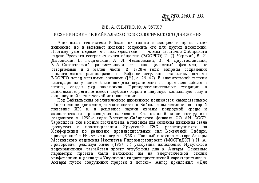 Снытко В.А., Зуляр Ю.А. Возникновение Байкальского экологического движения // Известия РГО. 2003. Т. 135. Вып. 3. С. 62-66.