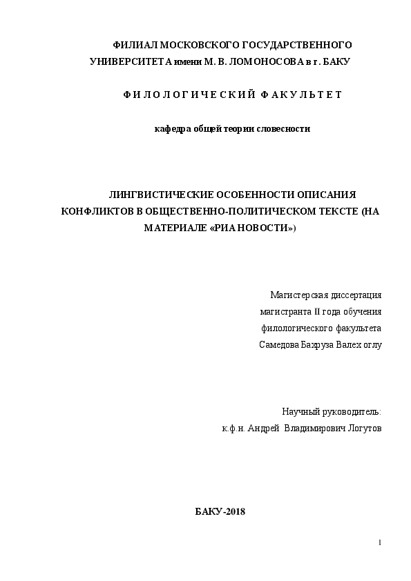 УНИВЕРСИТЕТА имени М. В. ЛОМОНОСОВА в г. БАКУ
