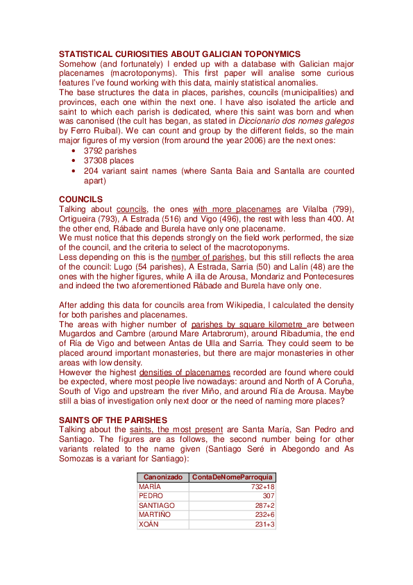 STATISTICAL CURIOSITIES ABOUT GALICIAN TOPONYMICS