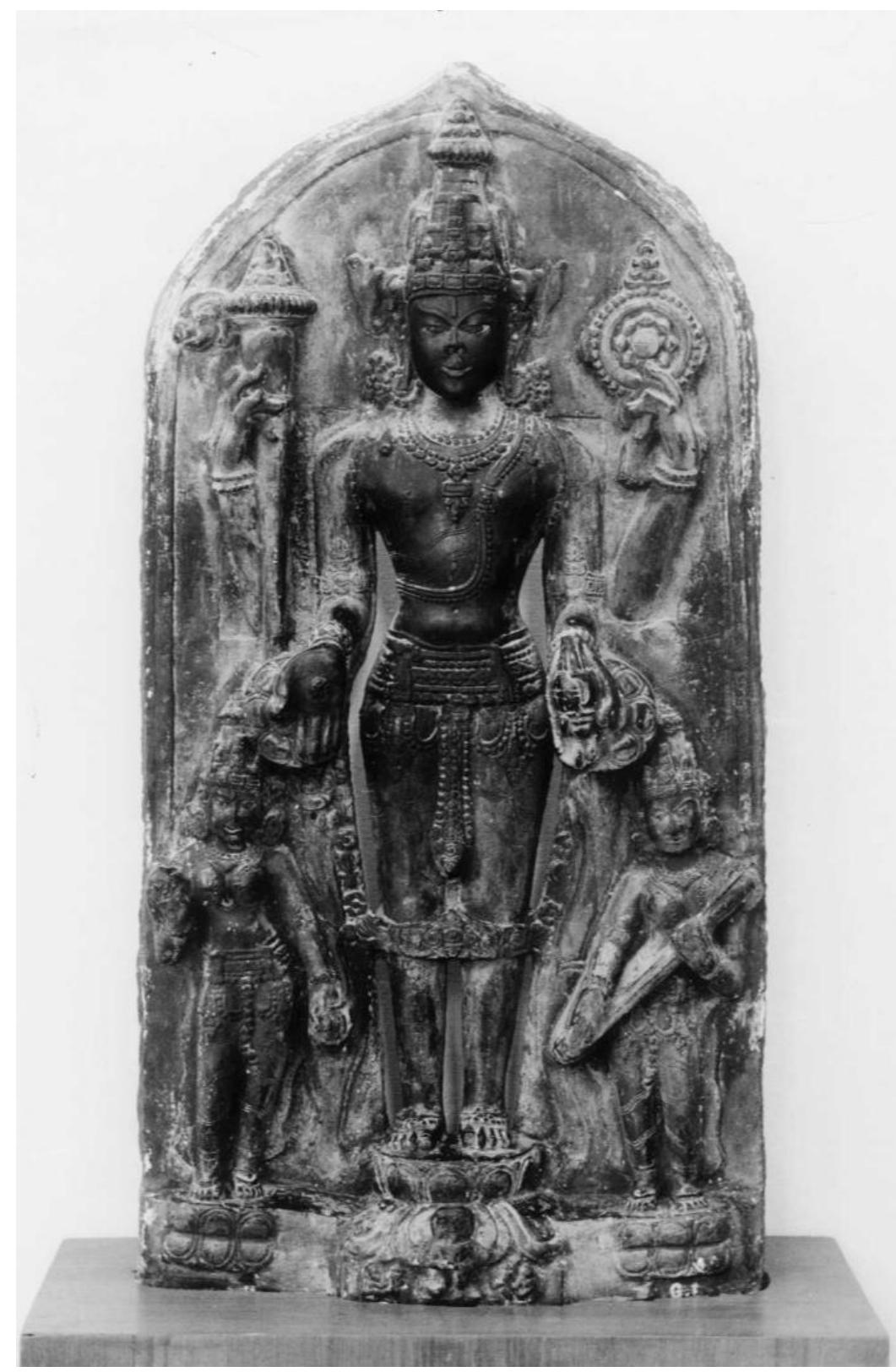 around 80 cm in height shows the god accompanied by his two wives Lakṣmī and Sarasvatī,