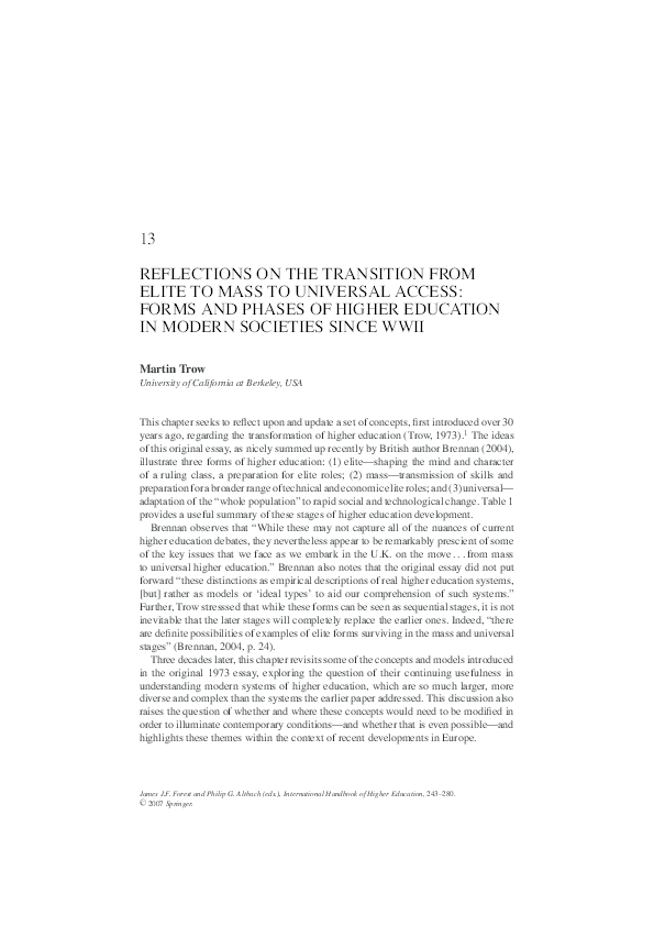 REFLECTIONS ON THE TRANSITION FROM ELITE TO MASS TO UNIVERSAL ACCESS: FORMS AND PHASES OF HIGHER EDUCATION IN MODERN SOCIETIES SINCE WWII