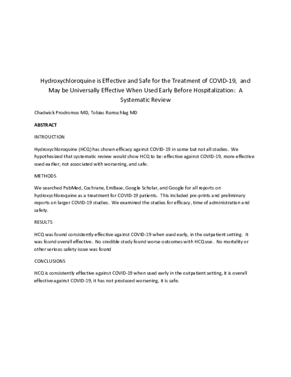 Hydroxychloroquine is Effective and Safe for the Treatment of COVID-19, and May be Universally Effective When Used Early Before Hospitalization: A Systematic Review