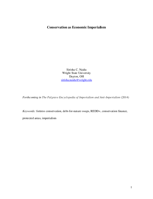 Keywords: fortress conservation, debt-for-nature swaps, REDD+, conservation finance,