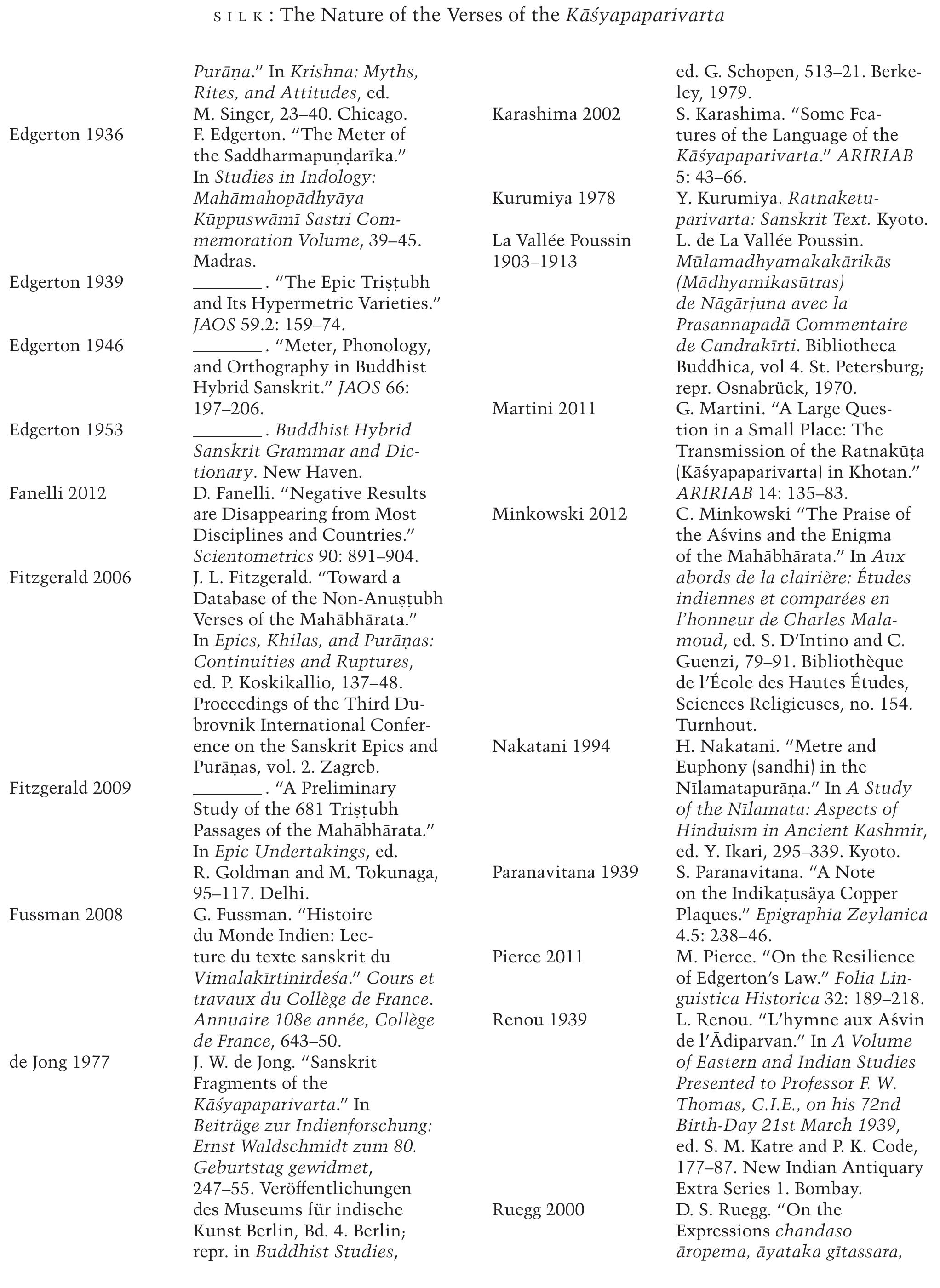| F. Edgerton. “The Meter of the Saddharmapundarīka.” In Studies in Indology: Mahāmahopādhyāya Kūppuswāmī Sastri Commemoration Volume, 39-45. | Karashima 2002 | S. Karashima. “Some Features of the Language of the Kāśyapaparivarta.” ARIRIAB 5: 43-66. | |