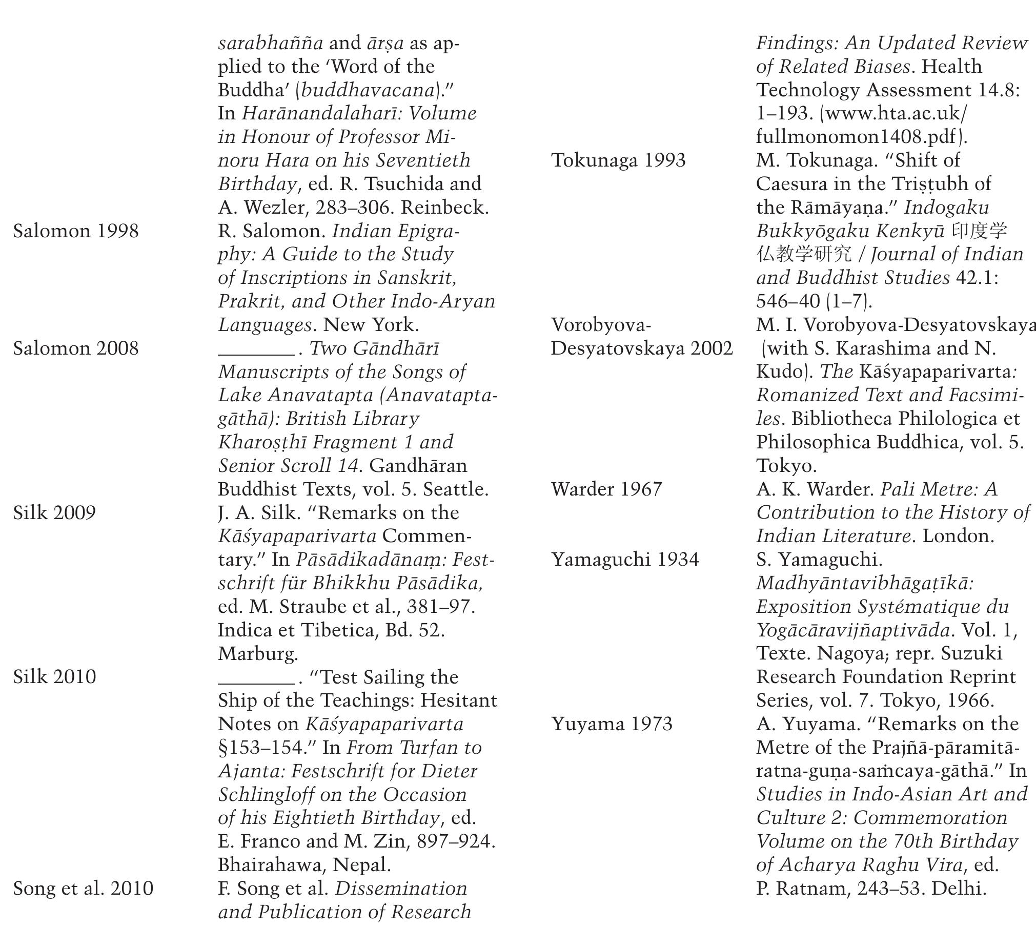 A. K. Warder. Pali Metre: A Contribution to the History of Indian Literature. London. S. Yamaguchi. Madhyāntavibhāgaṭīkā: Exposition Systématique du Yogācāravị̄̄aptivāda. Vol. 1, Texte. Nagoya; repr. Suzuki Research Foundation Reprint Series, vol. 7. Tokyo, 1966. A. Yuyama. “Remarks on the Metre of the Prajñā-pāramitā-ratna-guṇa-saṁcaya-gāthā.” In Studies in Indo-Asian Art and Culture 2: Commemoration Volume on the 70th Birthday of Acharya Raghu Vira, ed. P. Ratnam, 243-53. Delhi.